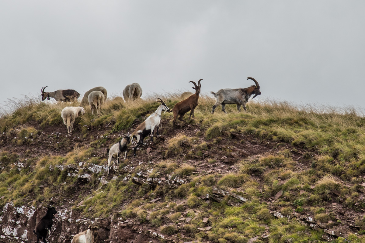 Wild goats hanging out with sheep.