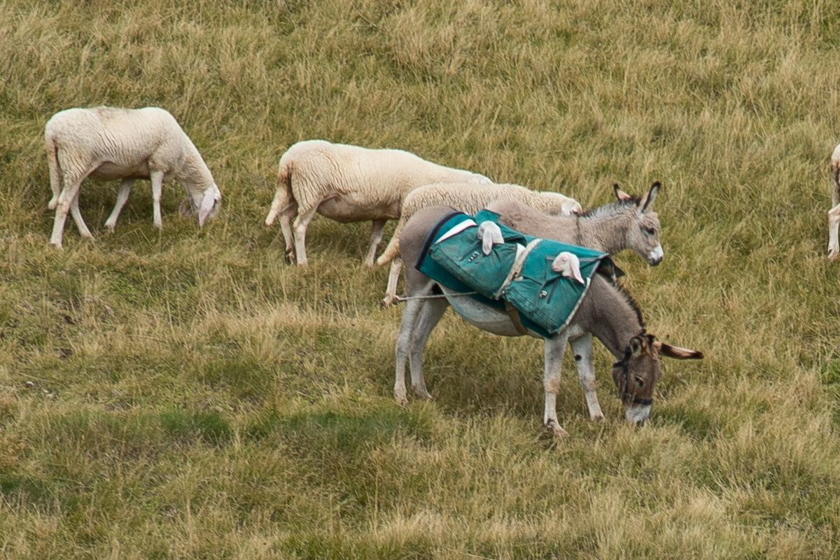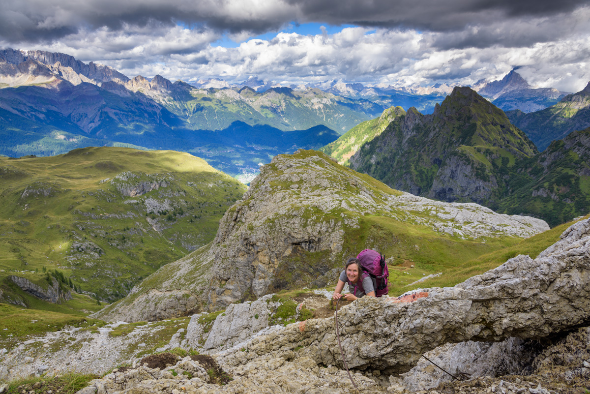 From Col Margherita. In this panorama you can see - way to the left - the green meadows we'd decended the day before from Forca Rossa. Panning right gives views of what we have ahead. Ups and downs through some pretty rugged mountains.